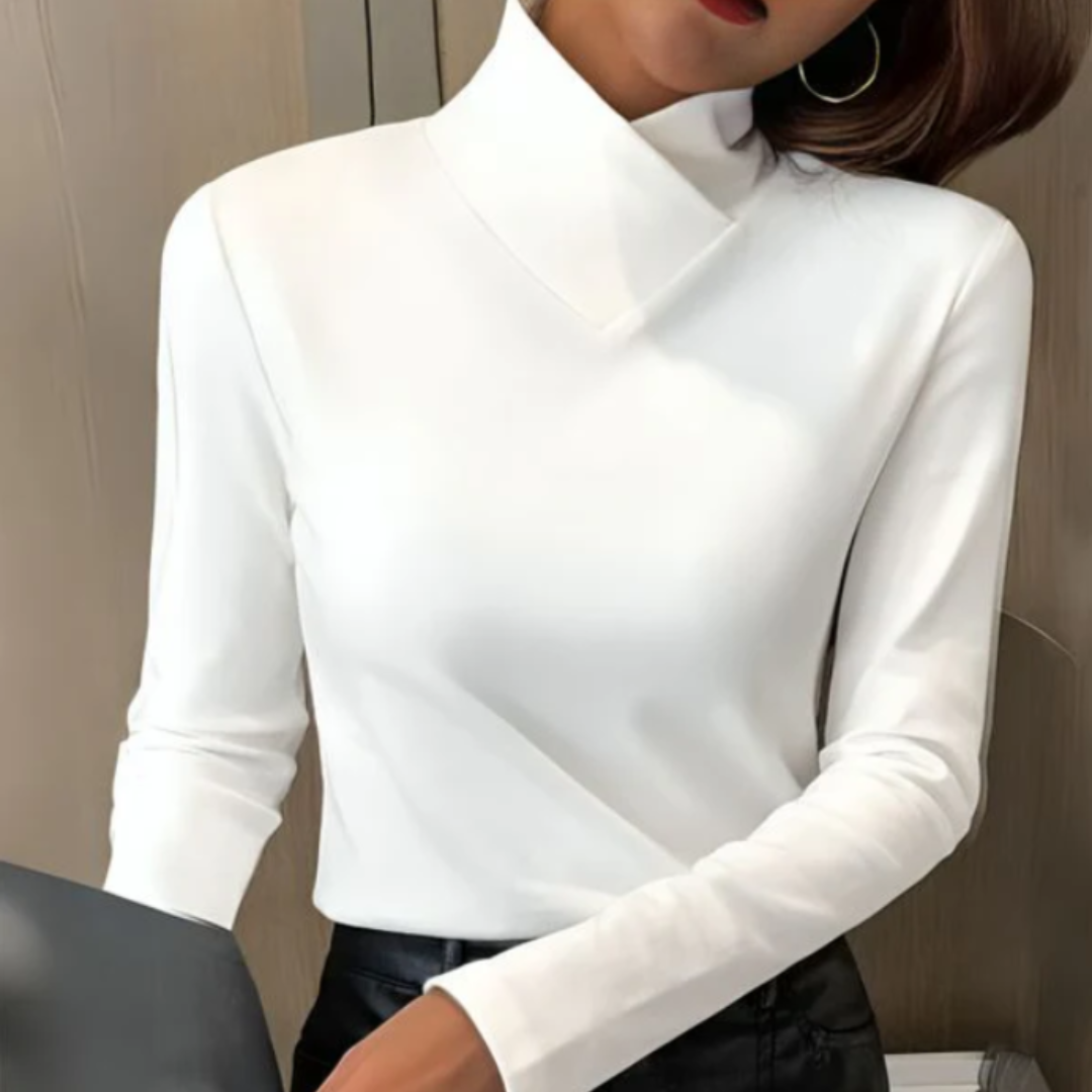 折り重なるようにデザインされたハイネックが、首元を上品に演出し、モダンで洗練された印象を与えます。